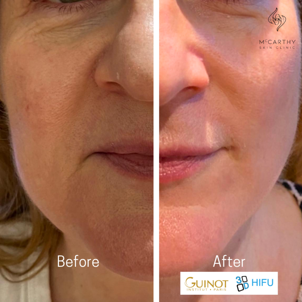 Meet Sarah, a middle-aged client who came to us concerned about visible signs of ageing, particularly a loss of firmness around her neck and jawline. After a thorough consultation, we created a bespoke skin transformation programme tailored to her goals. Her plan included full face and neck 3D HIFU sessions to deliver a deep lift and tighten the skin, alongside a course of Guinot Age Summum and Lift Summum facials to boost radiance and firm the complexion at a more superficial level.